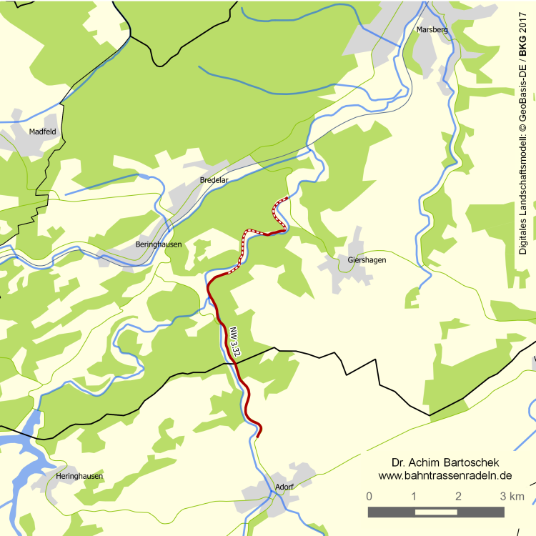 Nur ein kurzes Stück des Diemelradwegs verläuft auf der alten Schmalspurtrasse, einige weitere Abschnitte sind noch gut neben dem Weg bzw. der Straße erkennbar. |
