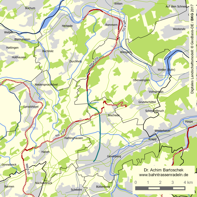 Radwegebau: | Südlich des ehemaligen Bahnhofs Witten-Höhe wurden zeitgleich mit dem Ausbau des tiefer gelegenen NW 4.05c einige 100 m der in Richtung Gevelsberg abzweigenden Strecke als Teil der Hochwasserumfahrung ausgebaut. Der neue Radweg schließt an dieses Stück an. Nach dem Freischnitt auf dem ersten 3,5 km langen Bauabschnitts zwischen der Stadtgrenze Witten und der Straße In der Ratelbecke in Albringhausen wurde am 6. Juni 2014 der Erste Spatenstich gesetzt. Der Bau erfolgte durch Straßen.NRW. Die Eröffnung verzögerte sich durch Felssicherungsarbeiten und ungeplanten Aufwänden an einem Viadukt mehrfach auf August 2017. |