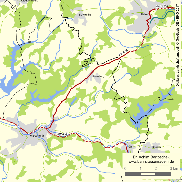 Nach der Stilllegung der aufwändig trassierten Strecken von Halver nach Radevormwald bzw. Wipperfürth wurde nur ein kurzer Abschnitt als Rad- und Wanderweg wiederverwendet – nachdem leider auch hier zwei Einschnitte verfüllt wurden. |