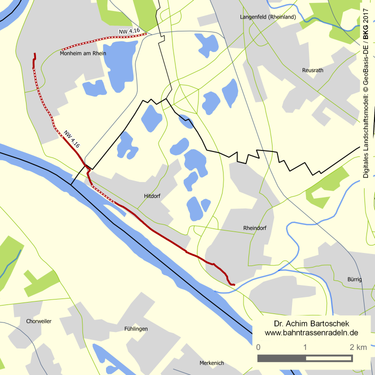 Überraschenderweise bin ich auch fast vor der Haustür fündig geworden: Dem Weg am Rhein sieht man nur beim genauen Hinsehen an, dass hier einmal eine Eisenbahn gefahren ist. In Monheim ist der flache Damm als direkte Verbindung vom Ort zum Pflanzenschutzzentrum ausgebaut. |