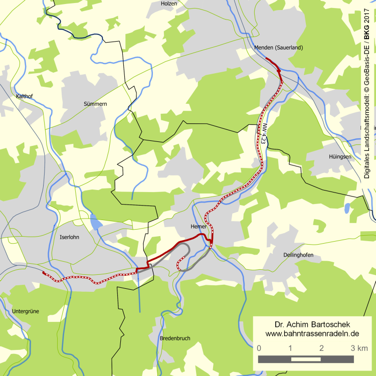 Status / Beschilderung: | Bahntrasse als kombinierter Fuß-/Radweg; Wegweisung als Teil des Radverkehrsnetzes (nur zwischen Hemer und Menden mit Streckenpiktogramm "Bahntrassenradweg"); Teil des „Ruhr-Lenne-Achter“ |