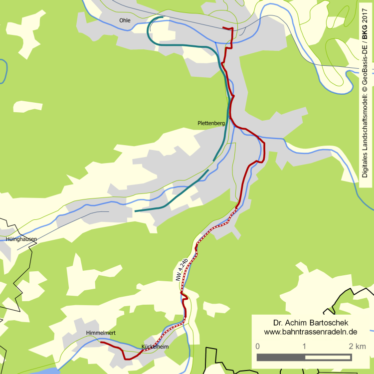 an der Einmündung Am Beiese den Bach links versetzt überqueren: Gansmecker Weg, dann schräg rechts: kurzer R/F (vermutlich im Zuge der alten Trasse; zwei Pfostensperren); an der Brücke schräg links: Am Oesterhammer (l. St.; geradeaus folgen) |