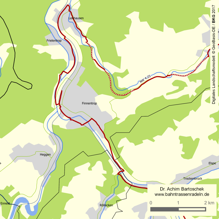 Radwegebau: | Als weitere Ergänzung im Umfeld des SauerlandRadrings wird in Finnentrop ein Radweg parallel zur nach Attendorn abzweigenden Strecke gebaut. Der Abschnitt zwischen Altfinnentrop und der Lennebrücke ist fertiggestellt, die Brücke zur Anbindung an den SauerlandRadring wurde im August 2016 eingehoben. |