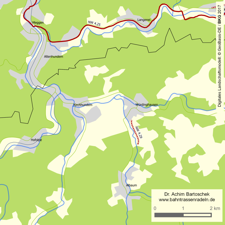 Höhenprofil: | langgez. l. St. von Würdinghausen (320 m ü. NN) in Richtung Heinsberg; an den Enden des Bahntrassenabschnitts kurz steiler |