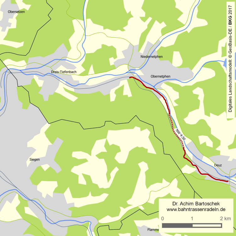 Status / Beschilderung: | Bahntrasse als kombinierter Fuß-/Radweg (landw. Verkehr frei); Wegweisung als Teil des Radverkehrsnetzes ohne Streckenpiktogramm "Bahntrassenradweg") und des Siegtal-Radwegs |