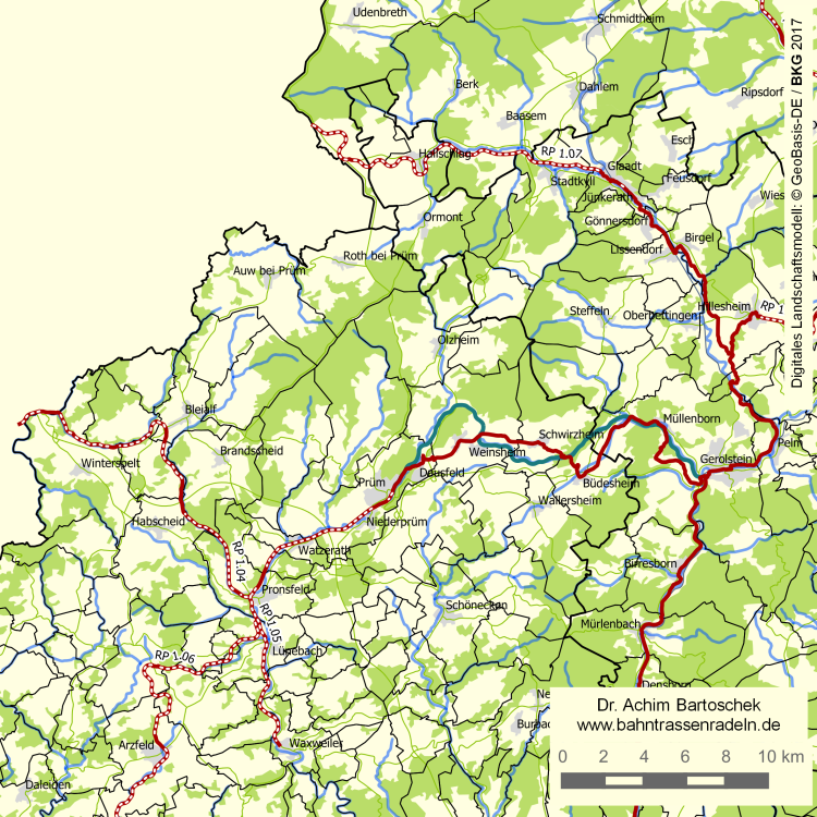 asphaltiert; der ursprünglich wassergebundene Weg zwischen Prüm und Niederprüm wurde nach einem Beschluss des Rats der Verbandsgemeinde vom September 2010 im Frühjahr 2011 asphaltiert. Dabei wurde in Prüm zwischen Gerberweg und dem Kreisverkehr Ritzstraße ein weiterer Abschnitt der Bahntrasse ausgebaut. Im Frühjahr 2016 wurde der zunächst mit Recycling-Material befestigte Abschnitt zw. Ihren und der Grenzbrücke östlich Steinebrück ebenfalls asphaltiert. |