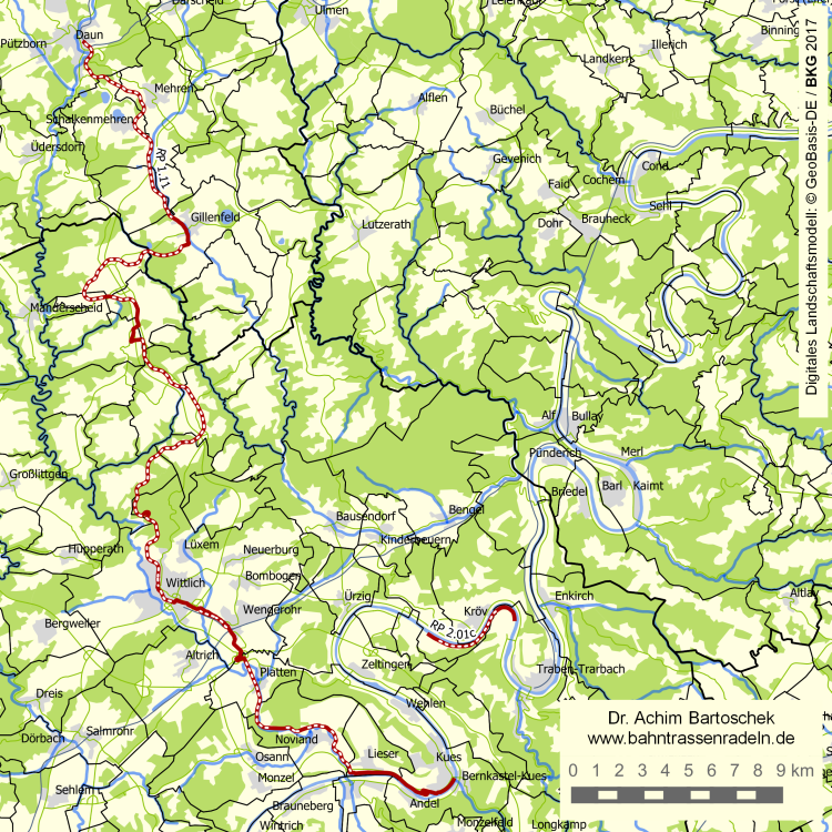 l. St. vom Bf Daun (400 m ü. NN) bis zum Tunnel "Großes Schlitzohr" (480 m), langgez. l. Gef. bis Gillenfeld (400 m), l. hügelig (max. 450 m) bis Laufeld (420 m), l. Gef. bis zum Bf Plein (330 m; einige kürzere Rampen, da mehrere Bahnbrücken fehlen) und langgez. deutliches Gef. nach Wittlich (170 m); anschließend leichtes Ausrollen bis zur Liesermündung in die Mosel (110 m) |