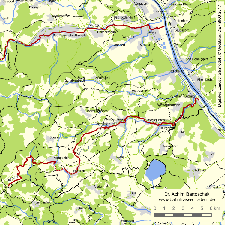 Zwischen Engeln und Weibern sind zwei weitere kurze Abschnitte begehbar, im Bereich des ehem. Gbf Weibern ist der genaue Verlauf der Trasse kaum noch zu erkennen); die Wegebeschreibung enthält den bisher beschilderten Brohltal-Radweg mit der Anbindung zum Bf Brohl an der linken Rheinstrecke (36 km) |