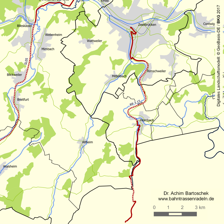 Bahntrassenabschnitte: 5,7 km zw. Rimschweiler und Hornbach sowie 1,5 km nördlich Volmunster |