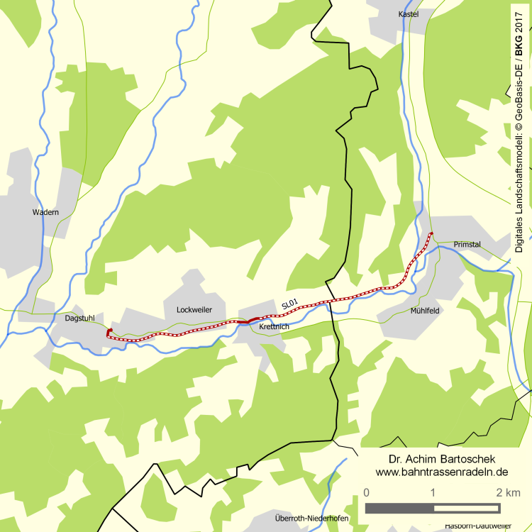 s. l. St. von Lockweiler (280 m ü. NN am Beginn des Bahntrassenwegs) nach Primstal (320 m); die angrenzenden Abschnitte des Saarland-Radwegs sind deutlich hügliger |