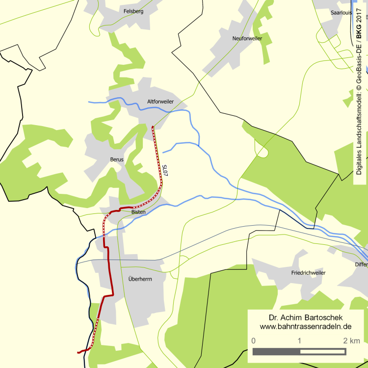 Hinter der Brücke über die Bist ist die Trasse in Überherrn überbaut.
