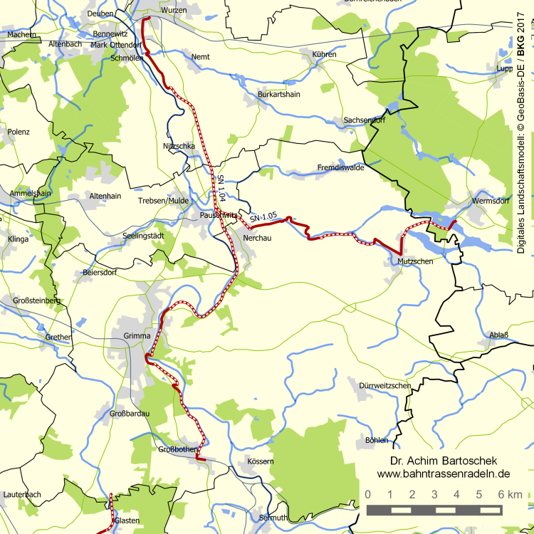 s. l. St. von Neichen (130 m ü. NN) nach Wermsdorf (170 m) mit Kuppen auf den Abschnitten abseits der Trasse in Denkwitz, Cannewitz und Mutzschen |