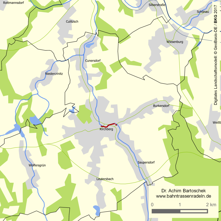 Abzweig eine freigeg. F (Verbundpflaster) von der Schneeberger Straße / S 281 in KIRCHBERG; schräg rechts auf der restaurierten Kleinbahnbrücke den Rödelbach überqueren, dann Gartenstraße |
