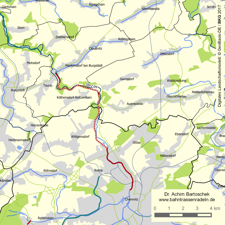 Radwegebau: | Die am 30. November 2005 bzw. 24. November 2006 eröffneten ersten beiden Bauabschnitte des Chemnitztalradwegs verlaufen nicht auf der ehemaligen Bahntrasse. BA 1: 1,3 km zw. Lohrstraße und Dammweg (Baubeginn 6. Juni 2005); BA 2: 1,7 km zw. Dammweg und Bornaer Straße (Baubeginn 3. Juli 2006). Als 3. BA wurde am 31. Mai 2011 die Verlängerung bis zur Heinersdorfer Straße (hinter der Kläranlage) abgeschlossen. Der Chemnitztalradweg hat damit die alte Bahntrasse erreicht. Dieser Abschnitt hatte sich wie die weiteren aufgrund von Problemen bei der Finanzierung verzögert und war in zwei Unterabschnitte aufgeteilt. BA 3.1: 1,2 km zw. Bornaer Straße und BAB 4 (für 2008 geplant; realisiert: 2009), BA 3.2: 900 m zw. BAB 4 und Heinersdorfer Straße (für 2009 geplant; realisiert bis Mai 2011). Der ursprüngliche Zeitplan sah für den BA 4.1 von der Heinersdorfer Straße bis zur Unteren Hauptstraße in Wittgensdorf die Fertigstellung bis 2010 vor. Dieser Abschnitt wurde seit dem 15. September 2014 erstellt und am 11. März 2016 freigegeben. Der Abschnitt Wittgensdorf – Markersdorf verläuft bis auf eine kurze Umfahrung des ehemaligen Bahnhofs Auerswalde-Köthensdorf vollständig auf der Trasse. Der Freischnitt wurde im Winter 2014/15 durchgeführt. Nachdem 2015 mit der Sanierung der Brücken und des Tunnels bei Auerswalde begonnen wurde, ruhten die Arbeiten im Tunnel aus Naturschutzgründen bis zum Frühjahr 2016 und wurden im gleichen Jahr abgeschlossen. Die offizielle Eröffnung fand am 8. April 2017 statt. In Markersdorf wurde ein kurzes Stück des Radwegs zwischen dem BÜ an der Wohnsiedlung Kolonie und der Einmündung in die Staatsstraße bereits ab September 2009 in Zusammenhang mit dem Ausbau der Bundesstraße erstellt. Der 2013 durch ein Hochwasser in Mitleidenschaft gezogene Chemnitzer Abschnitt zwischen Fischweg und Bornaer Straße wurde bis Juni 2015 wiederhergestellt. Für den anschließenden Abschnitt von Markersdorf nach Diethensdorf, auf dem der Radweg auf 2,2 km neben der Museumsbahnstrecke verläuft, wurde das Baurecht im Dezember 2013 erteilt. Mit dem Bau sollte im März 2017 begonnen werden, was sich aber nach den Ergebnissen einer ersten Ausschreibung auf 2018 verzögert hat. Die Freigabe erfolgte im August 2021. |