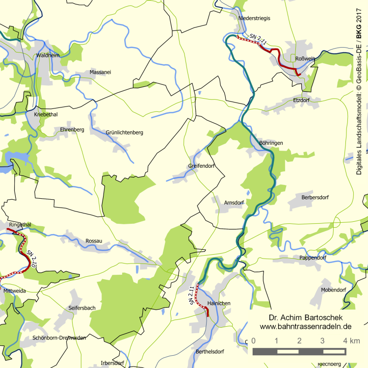 Route: | Hainichen (geplant: – Bf Berbersdorf – Tiefenbach – Grunau –) Roßwein |