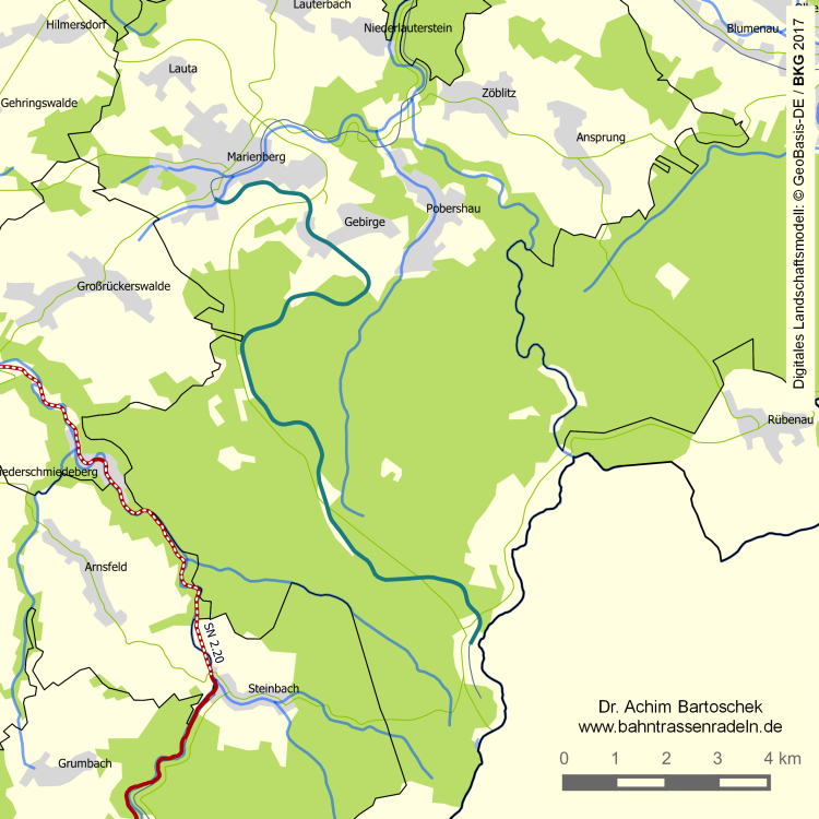Planungen: | Der Rat der Großen Kreisstadt Marienberg hat im November 2012 dem Kauf der Strecke mit dem Ziel zugestimmt, einen Rad- und Wanderweg zu errichten. Zwischen Anfang Mai und September 2013 wurden Gleise und Schwellen entfernt. Seit September 2017 steht nach einer Variantenprüfung fest, dass tatsächlich die ehemalige Bahntrasse genutzt werden kann. In Marienberg wird der Weg an der Reitzenhainer Straße mit einer Rampe anstelle der alten Brücke beginnen, da die weiter in Richtung Zentrum gelegene Brücke über die Äußere Annaberger Straße durch einen Damm ohne Durchlass ersetzt werden soll. Bei Gelobtland sahen die ersten Entwürfe den Abbruch einer weiteren Brücke vor, was in der örtlichen Politik aber auf Widerspruch stieß. Das Südende wird die Rudolf-Breitscheid-Straße in Reitzenhain sein. Mit dem in vier Abschnitte unterteilten Bau sollte erst 2026/27 begonnen und innerhalb von zwei Jahren fertig gestellt werden, wobei die ursprünglich genannten Kosten von rund 4,4 Mio Euro Kosten nicht mehr zu halten sind. Nach der am 16. August 2023 durch die Landesdirektion Sachsen erfolgte Genehmigung des ersten, 8,8 km langen Bauabschnitts von Marienberg bis zum ehemaligen Bahnhof in Gelobtland könnte es jetzt doch schneller gehen. Die Bahnstrecke von Pockau nach Marienberg soll reaktiviert werden. [August 2023] |