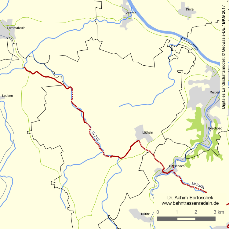Der gut ausgebaute Abschnitt von Robschütz nach Löthain mit kleinem Eisenbahnmuseum steht in deutlichem Kontrast zu dem langsam zuwachsenden Weg entlang des Käbschützer Baches, der abrupt am ehemaligen Bahnhof Käbschütz endet. |