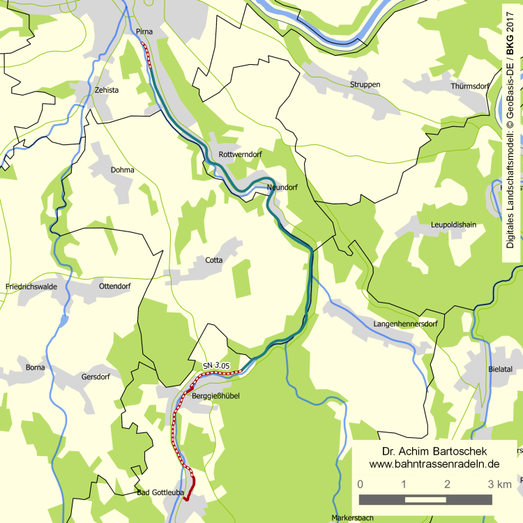In Pirna wurde zwischen Juli 2024 und November 2024 ein 1,7 km langer Weg überwiegend auf der ehem. Bahntrasse von der Dresdener Straße bis zum Walkmühlenweg gebaut. Die Bahnbrücke über die Gottleuba wurde dabei ausgespart, der Brückenneubau über die Seidewitz erfolgt erst 2025. |