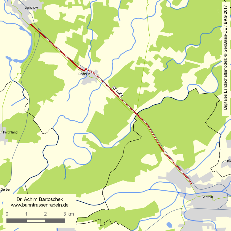 Ein Ausbau der abgebauten Bahnstrecke als bundesstraßenbegleitender Radweg war für 2013 vorgesehen, musste aber u. a. aus finanziellen Gründen verschoben werden. Er sollte ursprünglich beginnend mit dem Abschnitt Redekin – Jerichow in zwei Etappen erfolgen, konnte dann aber nach der Übertragung der Bauverantwortung auf die Stadt Jerichow in einem Rutsch für die Gesamtstrecke angegangen werden. Der Bau des Radwegs erfolgte zwischen dem 10. Juni (Erster Spatenstich) und Ende Oktober 2015. Auf zwei Abschnitten wurde von der Bahntrasse abgewichen und ein straßennäherer Radweg erstellt. |