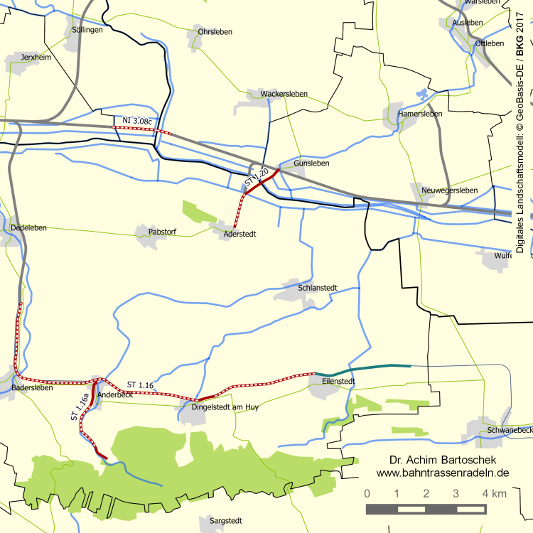 Zwischen Dedeleben und Eilenstedt soll in den nächsten Jahren ein Bahntrassenweg gebaut werden. Der erste Abschnitt von Anderbeck nach Badersleben wurde im Juni 2017 eingeweiht, der zweite von Badersleben nach Vogelsdorf folgte im Juni 2018. Da 2017 zwischen Vogelsdorf und Dedeleben außerorts ein straßenbegleitender Radweg entstanden ist, ist in diesem Bereich kein weiterer Ausbau der Bahntrasse zu erwarten. Anfang April 2019 wurde mit dem Ausbau des 4,7 km langen Abschnitts von Anderbeck bis zur K 1315 östlich von Dingelstedt begonnen. Dieser 3. BA wurde Ende Oktober 2019 eingeweiht. Im vierten Schritt wurde der Weg um 2900 m bis zur Bahnhofstraße in Eilenstedt verlängert (Baubeginn: März 2021, Eröffnung 20. Mai 2021). Mit einer Förderung aus dem Programm "Stadt und Land" wurde der Weg 2022 über Eilenstedt hinaus nach Haus Nienburg verlängert: Nach dem Freischnitt hatten die eigentlichen Bauarbeiten am 30. März 2022 begonnen, sodass der Abschnitt am 18. August 2022 feierlich eröffnet werden konnte. |