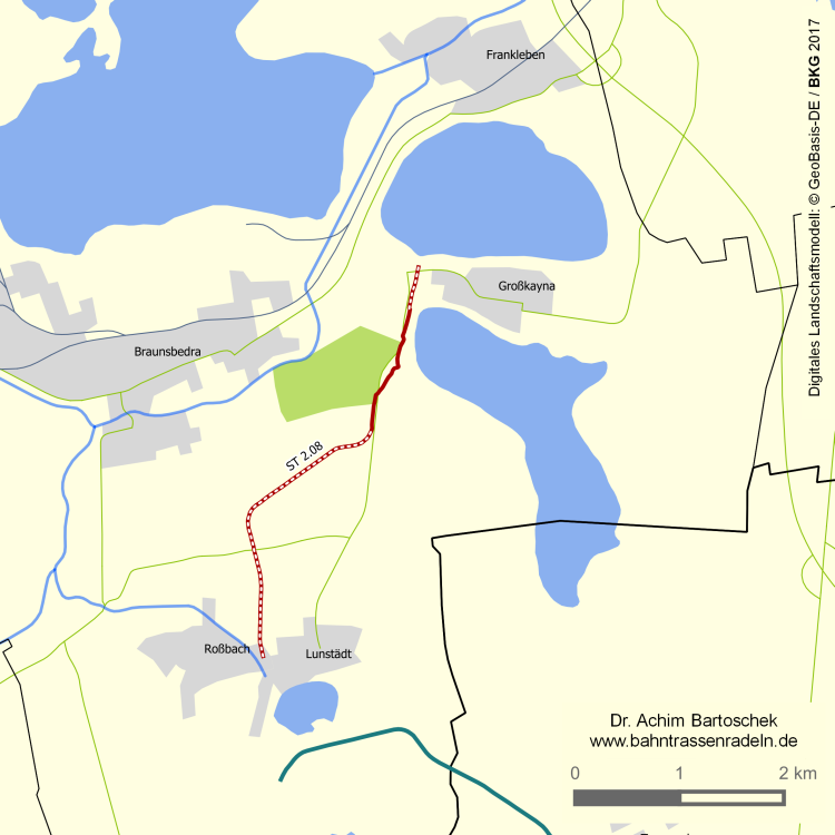 der Bahntrassenweg endet an der K 2167 zwischen Rossbach und Lunstädt |