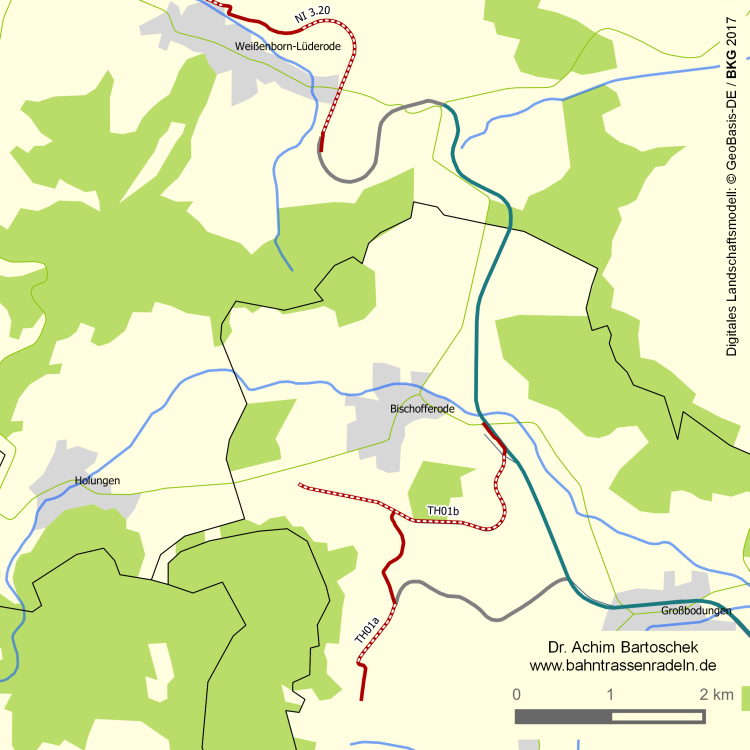 hinter dem Ende des R/F (Pfostensperre) mit k. Gef. auf die Ladestraße (Kopfsteinpflaster) des ehem. Bahnhofs BISCHOFFERODE und am Empfangsgebäude vorbei zur Bahnhofstraße / L 1011 (3,4) |
