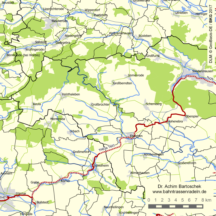4,5 rechts: Die Bahntrasse ist bis zum ehem. Bf Bollstedt als Radweg ausgebaut (700 m), aber nicht Teil des Unstrut-Werra-Radwegs. |