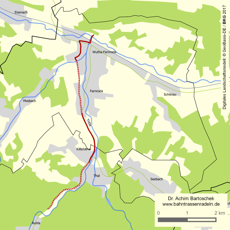 Beginn des Radwegs auf der Trasse (nicht beschildert und recht schwer zu finden): Am Ortseingang Wutha-Farnroda von der B 7 in die Mosbacher Straße links abbiegen (Fa. Petkus), dann links: "An der Allee" und in die Bahnhofsstraße.