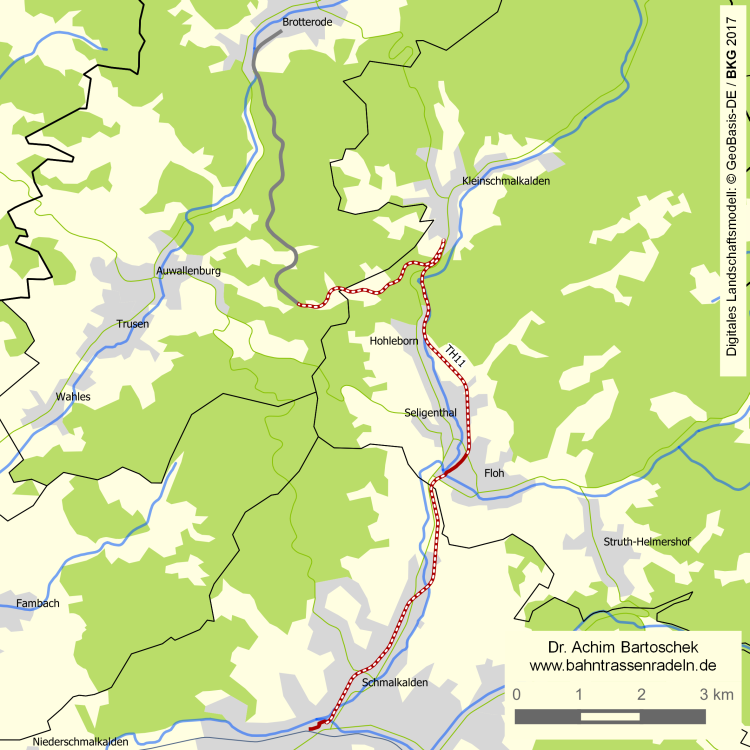 vor dem ehem. Bahnhofsgelände Kleinschmalkalden links zurück folgen (an dieser Stelle kein Zugang zum Ort); l. St. |