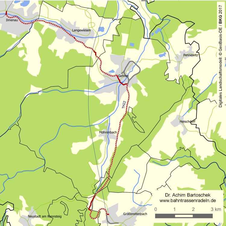 | Radwegebau: | Die Strecke wurde Mitte 2008 entwidmet und den Anliegerkommunen zum Kauf angeboten. Nachdem die Finanzierung lange nicht gesichert war (das Konjunkturpaket II konnte nicht dafür genutzt werden), wurde das Projekt zu 90 % aus Landesmitteln bestritten: Der Förderbescheid des Landes lag seit Dezember 2010 vor. Der Radweg wurde seit Anfang Juli 2011 innerhalb von zwei Jahren unter Federführung der Verwaltungsgemeinschaft "Langer Berg" gebaut: 2011 der knapp 2 km lange Abschnitt zwischen Ilmenau und der Stadtgrenze nach Langwiesen (Freigabe 6. April 2012), 2012 bis hinter Mörlenbach (Freigabe des 3,8 km langen Langewiesener Abschnitts am 17. August 2012, der 7,7 km lange Abschnitt von Gehren bis hinter Möhrenbach folgte am 12. Oktober). Mit der Fertigstellung des letzten Bauabschnitts (Baubeginn Sommer 2013) wurde der Gesamtweg am 25. Oktober 2013 eröffnet. Das Viadukt bei Gehren-Jesuborn wurde im Zuge des Ausbau der Bundesstraße 88 abgerissen.  |