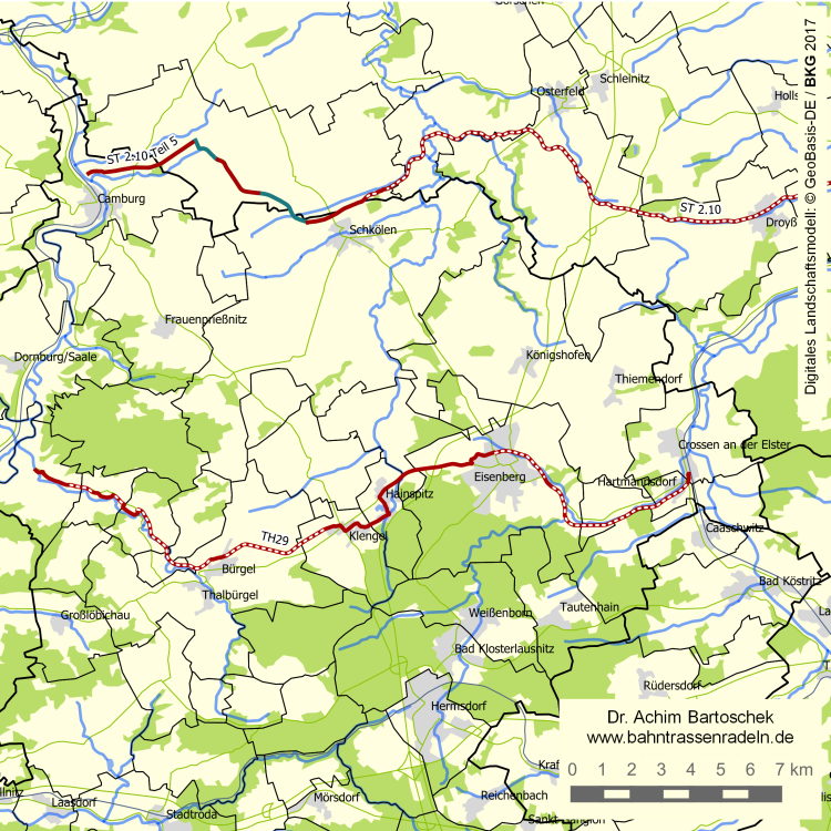 Der ältere, landschaftlich reizvolle und inzwischen zum Teil überarbeitete Abschnitt von Golmsdorf bis Trotz ist mit dem neueren, zum Glück meist recht straßenfernen Parallelweg zur B 7 von Eisenberg nach Hartmannsdorf zu einer Radroute zusammengewachsen, auf der man zwischen Saale und Weißer Elster nicht mehr auf die Bundesstraße muss. |