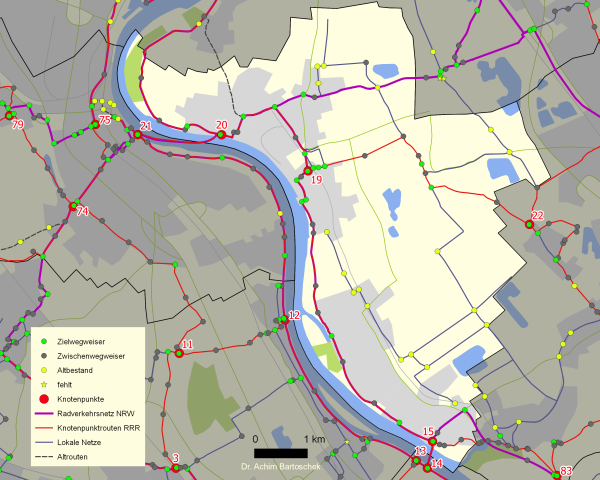 Die erste Bestandsaufnahme zum wegweisend beschilderten Radnetz in Niederkassel hatte ich bereits 2003 durchgeführt und nach der Installation des Radverkehrsnetzes des Landes (RVN) im Februar 2006 aktualisiert. Im Rahmen der zurzeit laufenden großflächigeren Analyse der Radwegweisung links und rechts des Rheins zwischen Köln und Bonn greife ich dies auch für Niederkassel wieder auf.