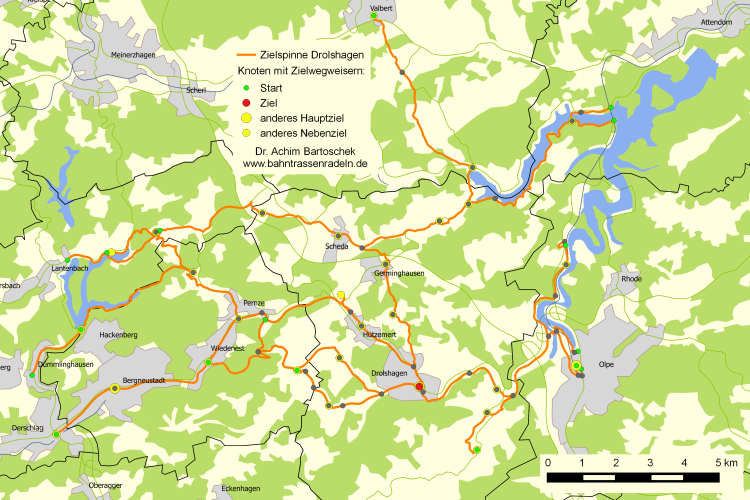 Die Routen auf einen Knotenpunkt hin lassen sich als einfache Zielspinne beschreiben, deren Startpunkte alle auf unmittelbar benachbarten Knotenpunkten liegen. Mehrere unterschiedliche Knotenpunktrouten können dabei abschnittsweise auf gleicher Strecke verlaufen, wenn sich der Verzweigungspunkt erst hinter dem Ausgangsknotenpunkt befindet.