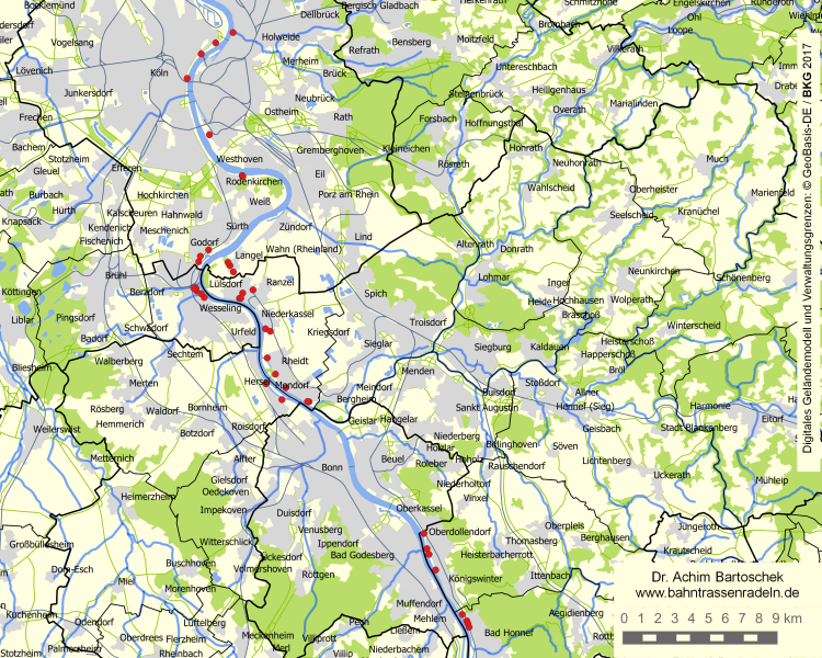 In Bonn gibt es als weitere Auffälligkeit eine Zuwegung, die selbst nicht Teil des Fernwegs ist, die in eine Richtung mit Einschüben in die HBR-Wegweisung ausgewiesen wurde.